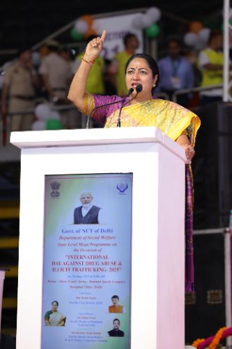 नई दिल्ली,। 26 जून 2025 । दिल्ली की मुख्यमंत्री रेखा गुप्ता ने आज अंतरराष्ट्रीय नशा और अवैध तस्करी निषेध दिवस के अवसर पर यमुना स्पोर्ट्स कॉम्प्लेक्स में आयोजित जनजागरूकता कार्यक्रम में भाग लिया। इस अवसर पर उन्होंने जनता से नशे के खिलाफ एक व्यापक मुहिम में भागीदारी करने का आह्वान किया। कार्यक्रम में दिल्ली सरकार में कैबिनेट मंत्री रविन्द्र इन्द्राज सिंह, सांसद मनोज तिवारी, विधायक ओम प्रकाश शर्मा , संजय गोयल एवं डॉ. अनिल गोयल भी उपस्थित रहे। इस अवसर पर मुख्यमंत्री सहित उपस्थित सभी लोगो ने नशे के खिलाफ एक टीम बनकर कार्य करने के लिए शपथ ली।