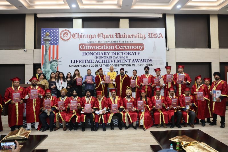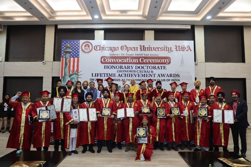 नई दिल्ली । 1 जुलाई 25 । शिकागो ओपन यूनिवर्सिटी ने GETCRR LLP और वर्ल्ड सिख चैंबर ऑफ कॉमर्स के सहयोग से भारत के संविधान क्लब, नई दिल्ली में एक भव्य दीक्षांत समारोह का आयोजन किया। इस समारोह में समाज और उद्योग जगत में उत्कृष्ट योगदान देने वाले विशिष्ट व्यक्तियों को “डॉक्टर ऑफ ऑनोरिस कॉसा” की उपाधि और “लाइफटाइम अचीवमेंट अवॉर्ड” से सम्मानित किया गया। समारोह की अध्यक्षता यूनिवर्सिटी के कुलपति द्वारा की गई।
