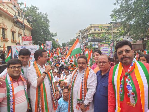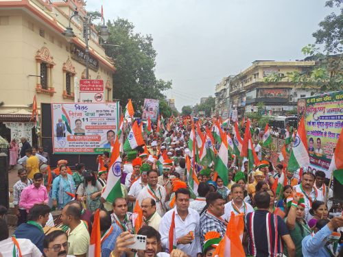 पूरे मार्ग में “हर गली–हर मोहल्ला, हर दिल में तिरंगा लहराएँ”, “हर घर तिरंगा–हर दुकान तिरंगा”, “तिरंगा आन भारत की–तिरंगा शान भारत की”, तथा “भारतीय सामान–हमारा स्वाभिमान” जैसे सशक्त और प्रेरणादायी नारों से वातावरण लगातार गूंजता रहा। यह केवल एक यात्रा नहीं, बल्कि देश की अस्मिता, स्वाभिमान और एकता का जीवंत प्रतीक बन गई।
