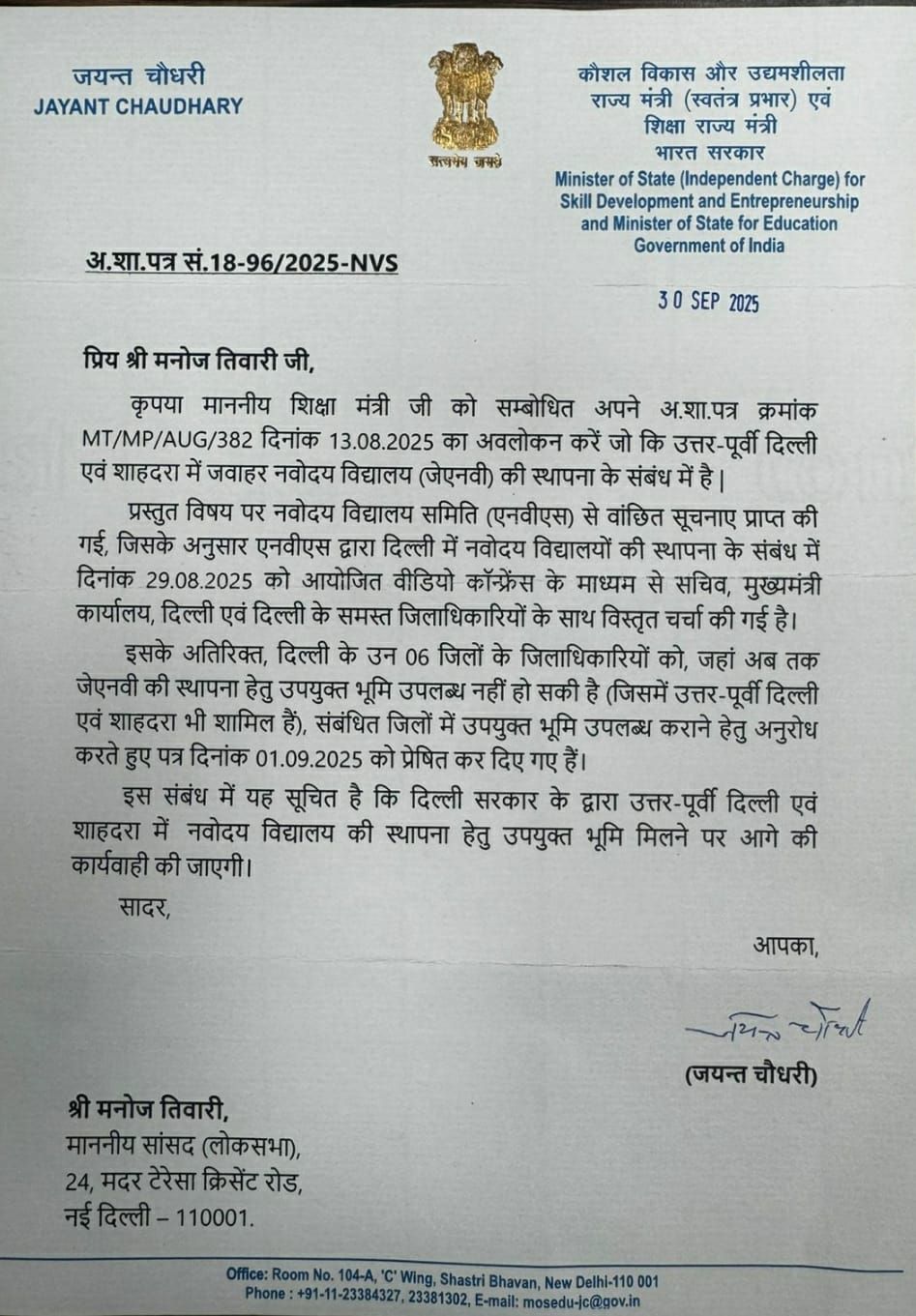 नई दिल्ली । 16 अक्टूबर 25 । निरंतर शिक्षा में सुधार लाने के लिए पहले केंद्रीय विद्यालय और अब उत्तर पूर्वी दिल्ली संसदीय क्षेत्र में दो जवाहर नवोदय विद्यालय बनाने के लिए जब जमीन आवंटन की प्रक्रिया पर जोर दिया जा रहा है और किसी पंचवर्षीय योजना में भीम पूरा करने के प्रयास किया जा रहे हैं यह कहना है उत्तर पूर्वी दिल्ली के सांसद मनोज तिवारी का उन्होंने कहा कि केंद्र सरकार हर प्रशासनिक जिले में एक-एक विद्यालय बनाने का संकल्प पहले ही ले चुकी थी लेकिन राज्य सरकार की ओर से असहयोग की भावना के चलते नवोदय विद्यालय नहीं बना सकी लेकिन जैसे ही सरकार बदली लंबित योजनाओं को बोल मिलना शुरू हो गया।
