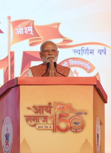 प्रधानमंत्री नरेंद्र मोदी ने अपने संबोधन में कहा, “आर्य समाज की 150वीं वर्षगांठ किसी एक समुदाय या पंथ का उत्सव नहीं है, यह संपूर्ण राष्ट्र की वैदिक पहचान से जुड़ा एक महोत्सव है।” उन्होंने कहा कि आर्य समाज ने भारत की सांस्कृतिक और आध्यात्मिक आत्मा को सुरक्षित रखते हुए समाज सुधार और राष्ट्रीय चेतना को नई दिशा दी है। प्रधानमंत्री ने आर्य समाज के प्रयासों की सराहना करते हुए कहा कि एक सदी और आधे से अधिक समय से यह संस्था वैदिक ज्ञान के प्रसार और नैतिक उत्थान का प्रेरक बनी हुई है।
